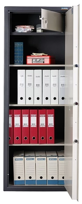 Модель ASM-165Т оснащена трейзером размерами 219х594х376 мм – отделением для денег, печатей и ценных мелочей, запираемым на ключ, – а также тремя съёмными полочками, которые можно передвинуть наиболее удобным образом. Исходя из размеров сейфа, он позволяет вместить до двадцати восьми папок-регистраторов формата А4 (типа Bantex, Корона и тому подобное).